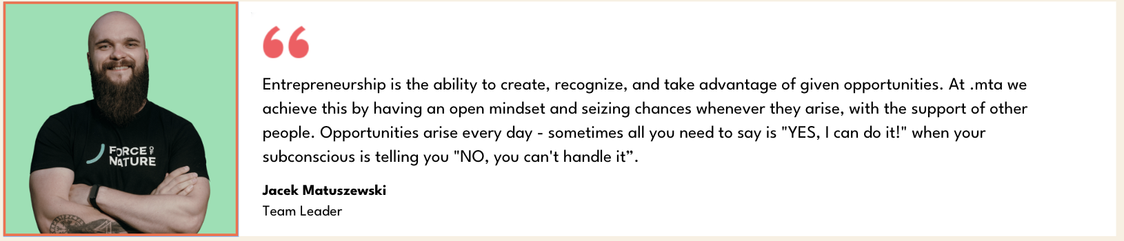 We also appreciate the initiative. We want our organization to be full of people who are determined to achieve their goals. We provide space for building your own teams and developing the organization because entrepreneurship is about intuition, seizing and creating opportunities, and patience. Not every success comes to you immediately, and sometimes you have to wait for it.