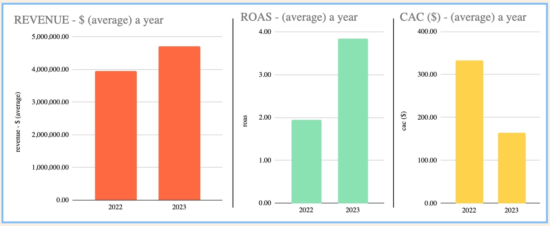 One of the goals was driving year-over-year revenue growth, with a set target of achieving at least a 20-30% increase compared to the previous year. This revenue growth was established as a top priority KPI alongside CAC (Customer Acquisition Cost) and ROAS (Return on Ad Spend).
