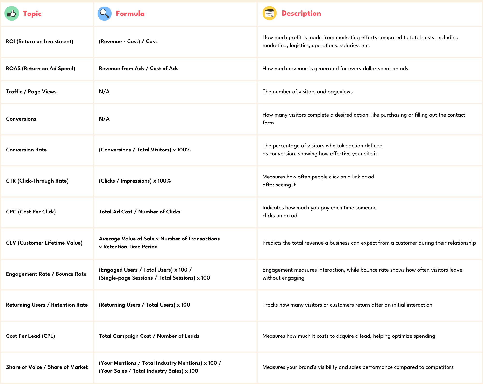 ROI is one of the most fundamental marketing metrics because it clearly shows how much profit your marketing activities generate relative to the cost. It answers the crucial question: Are your marketing efforts financially worthwhile?