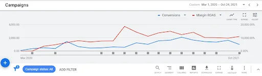 Almost a year and a half into our cooperation, in July 2021, we had enough data to change the main conversion on the account. We turned off conversion based on revenue and switched to optimizing towards ROI.